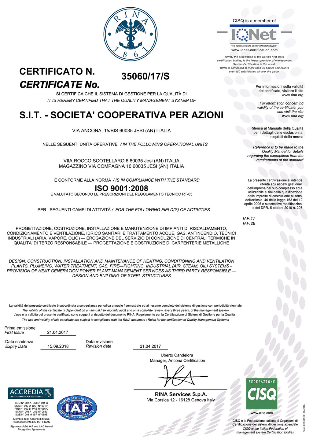 Il miglioramento è un obiettivo costante di S.I.T. ScpA; le certificazioni ottenute nel corso dell'attività ne sono la garanzia.